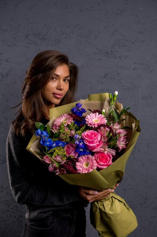 В данном букете используются сезонные цветы, которые приходят только в определенное время года. Если их нет в наличии, то флорист подберет наиболее подходящую замену по цветовой гамме. Состав: Упаковка, роза 3шт,гербера 3шт, альстромерия 3шт, дельфиниум 3шт, диантус 1шт, амарант 2шт,солидаго 1шт, рускус 5шт, диантус кустовой 1шт